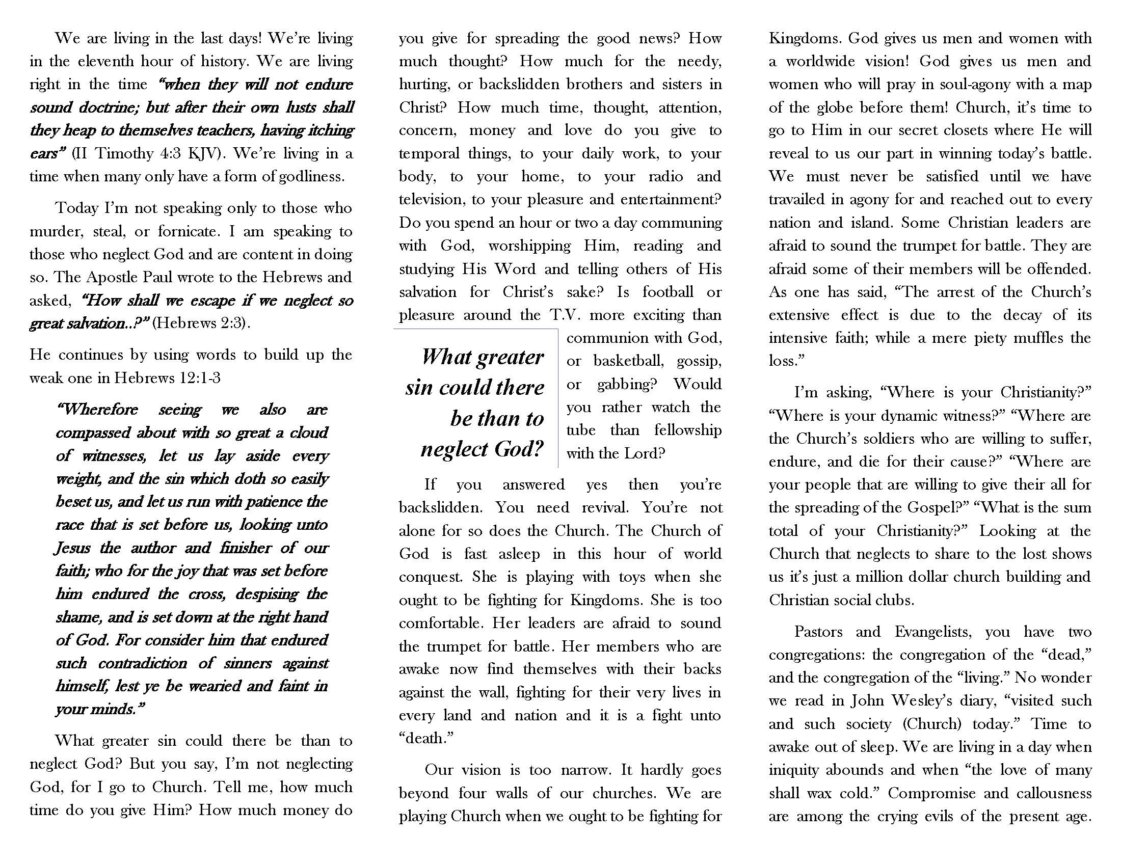 Written by Pastor Calvin Ledger this tract asks the question, “What greater sin could there be than to neglect God?”