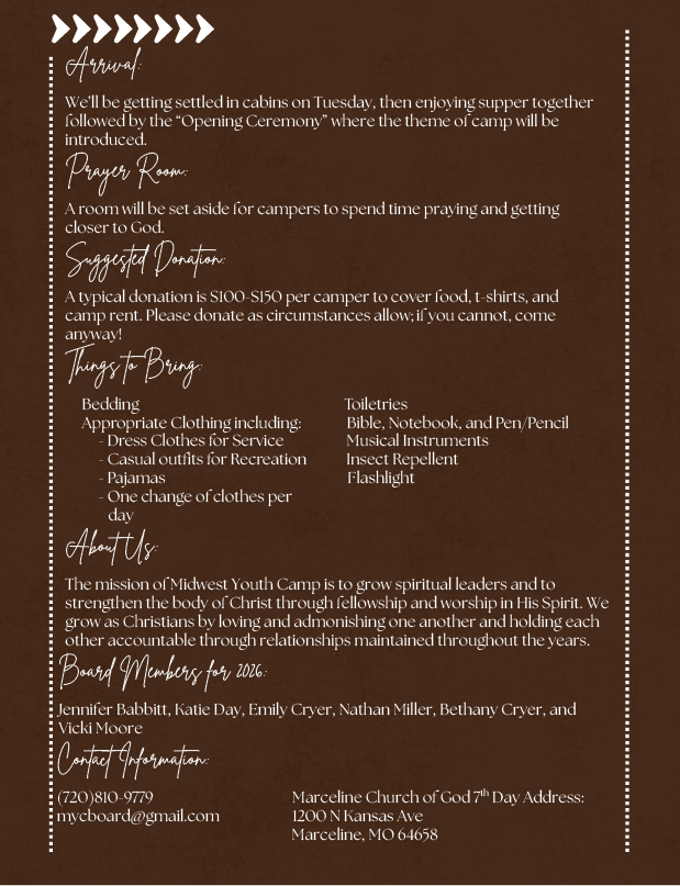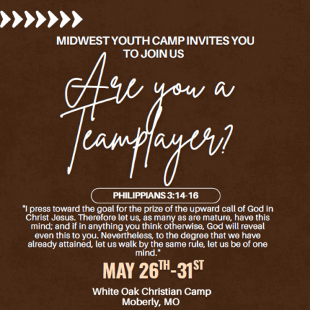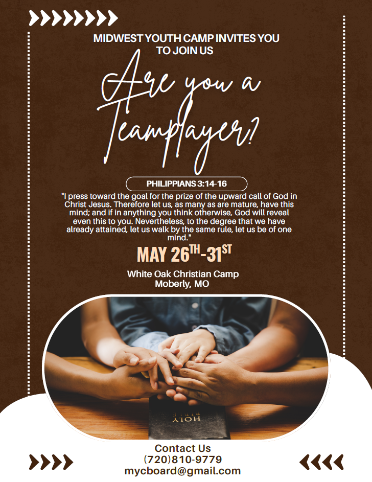 Midwest Youth Camp May 26 – 31, 2026 White Oak Christian Camp 521 W Urbandale Dr. Moberly, Mo 65270 Get Directions Are you a team player? Click Here to Download the Flyer For more information contact: my******@***il.com or 720-810-9779 Click here to learn about the youth camp scholarships being offered by the DOK!